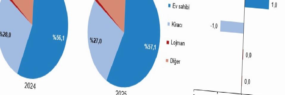 Oturulan konuta sahip olanların oranı geçen yıla nazaran 1,0 puan artarak 2025 yılında %57,1 olarak hesaplanırken, kirada oturanların oranı %27,0, lojmanda oturanların oranı %0,9, kendi konutunda oturmayıp kira ödemeyenlerin oranı ise %15,0 oldu.