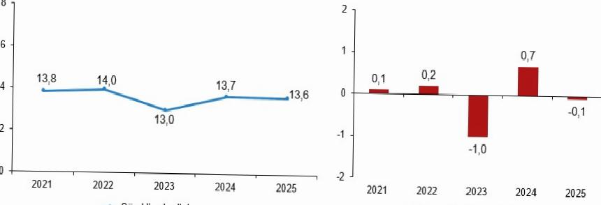 Sürekli yoksulluk oranı ve bir evvelki yıla nazaran fark, 2021-2025