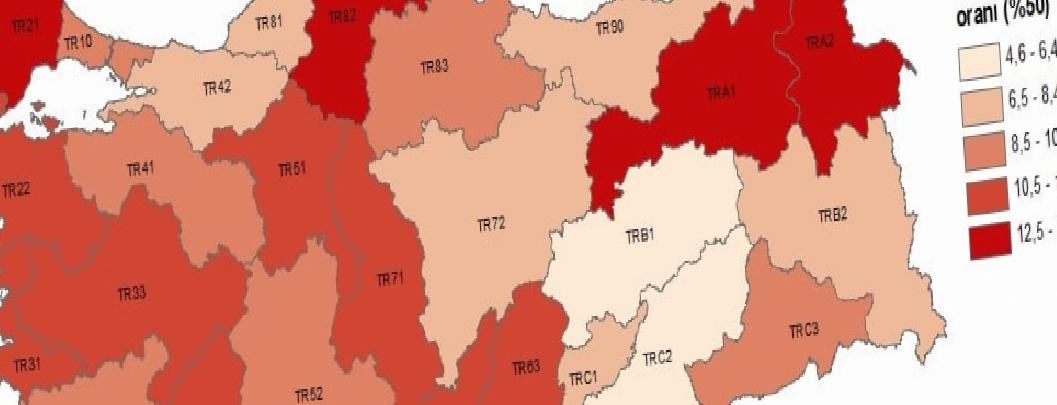 İBBS 2. Seviye bölgelerinin her biri için muadil hanehalkı kullanılabilir fert medyan gelirinin yüzde 50’sine nazaran hesaplanan yoksulluk sonuna nazaran, gelire dayalı rölâtif yoksulluk oranının en yüksek olduğu bölgeler; %14,5 ile TR21 (Tekirdağ, Edirne, Kırklareli), %14,3 ile TR82 (Kastamonu, Çankırı, Sinop) oldu.