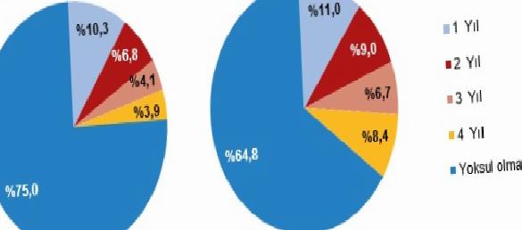 Dört yıllık panel bilgi kullanılarak medyan gelirin yüzde 50’sine nazaran hesaplanan yoksullukta kalma mühleti incelendiğinde, dört yıl boyunca (panel süresince) fertlerin %10,3’ü bir yıl, %6,8’i iki yıl, %4,1’i üç yıl, %3,9’u ise dört yıl yoksullukta kaldı. Nüfusun %75,0’ı ise dört yıl boyunca hiç yoksulluk sonunun altında kalmadı.