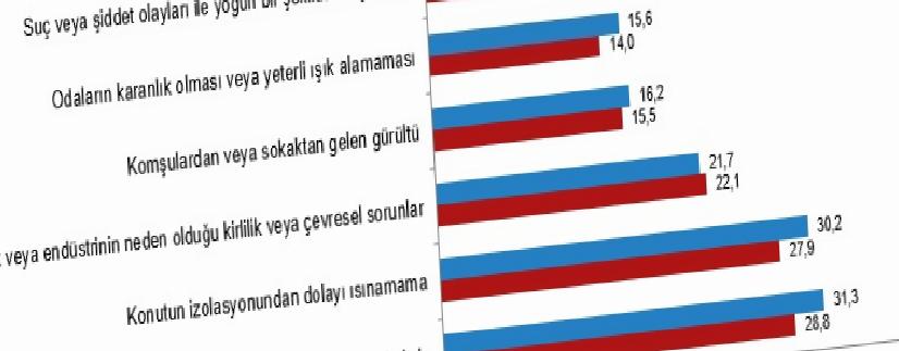 Kurumsal olmayan nüfusun %28,8’i sızdıran çatı, nemli duvarlar, çürümüş pencere çerçeveleri vb. sorunlar yaşarken %27,9’u konutunda izolasyondan ötürü ısınma sorunu, %22,1’i trafik yahut sanayinin neden olduğu hava kirliliği, etraf kirliliği yahut başka çevresel problemlerle karşılaştı.