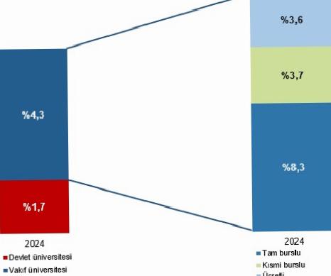 Devlet üniversitesi mezunlarında beyin göçü oranı 2023 yılında %1,7 iken, 2024 yılında değişmeyerek tıpkı kaldı. Vakıf üniversitesi mezunlarında beyin göçü oranı 2023 yılında %4,5 iken, 2024 yılında %4,3 oldu. Vakıf üniversitesi mezunları ortasında 2024 yılında en yüksek beyin göçü oranı %8,3 ile tam burslu eğitim alanlarda gözlemlenirken, bu sırayı %3,7 ile kısmi burslu eğitim alanlar ve %3,6 ile fiyatlı eğitim alanlar izledi.