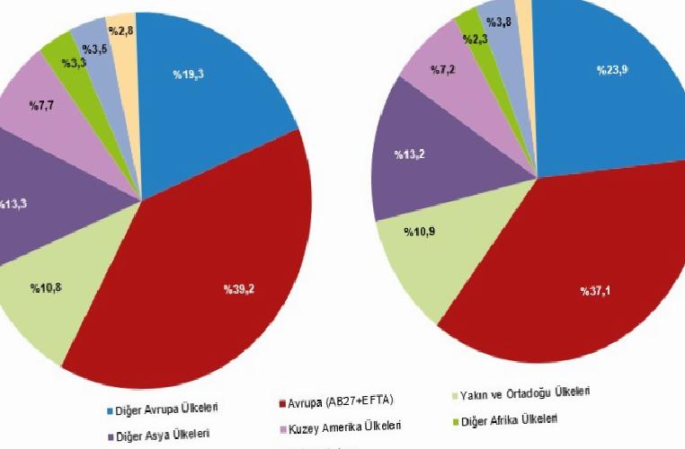 Avrupa (AB27+EFTA) ülkeleri 2024 yılında teşebbüs sayısında %39,2; ciroda %37,1 hisse ile birinci sırada yer aldı. Öbür Avrupa ülkeleri ise %19,3 hisse ile teşebbüs sayısında, %23,9 hisse ile ciroda ikinci sırada yer aldı. Öteki Asya ülkeleri sırasıyla %13,3 ve %13,2 hisse ile teşebbüs sayısında ve ciroda üçüncü sırada yer aldı.