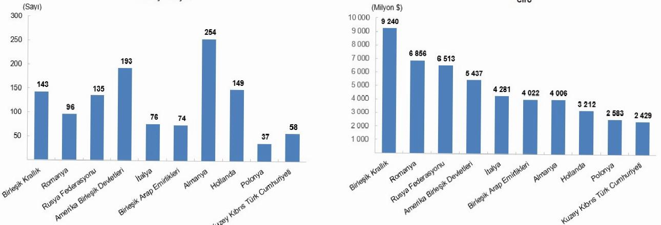Romanya, yurt dışında denetim edilen teşebbüs sayısı açısından 96, elde edilen ciro açısından da 6 milyar 856 milyon dolar ile ikinci sırada yer aldı. Ciroda 6 milyar 513 milyon dolar ile üçüncü sırayı alan Rusya Federasyonu’nda denetim edilen teşebbüs sayısı 135 olarak gerçekleşti.