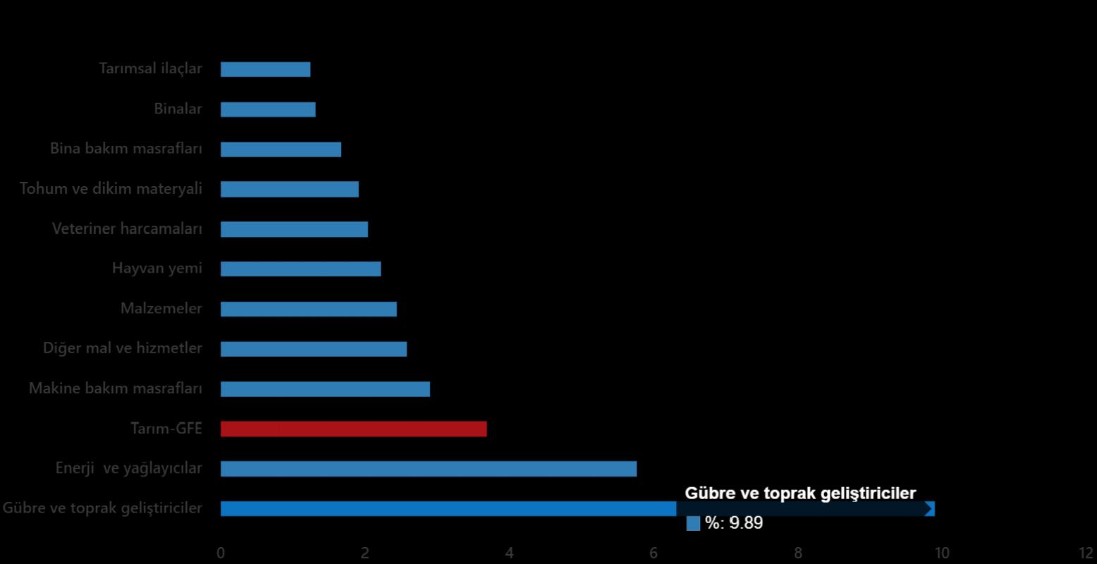 Yıllık değişimin en yüksek olduğu alt küme %63,52 artış ile veteriner harcamaları, aylık değişimin en yüksek olduğu alt küme %9,89 artış ile gübre ve toprak geliştiriciler oldu.